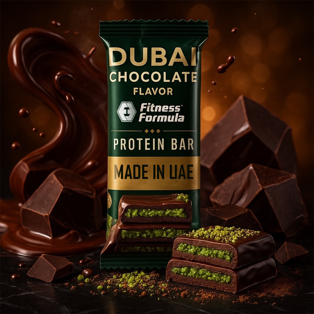 Насыщенный вкус фисташек идеально дополняет нежность шоколада, создавая незабываемое сочетание вкуса и аромата в батончике Fitness Formula Protein Bar Dubai Chocolate (40 g).